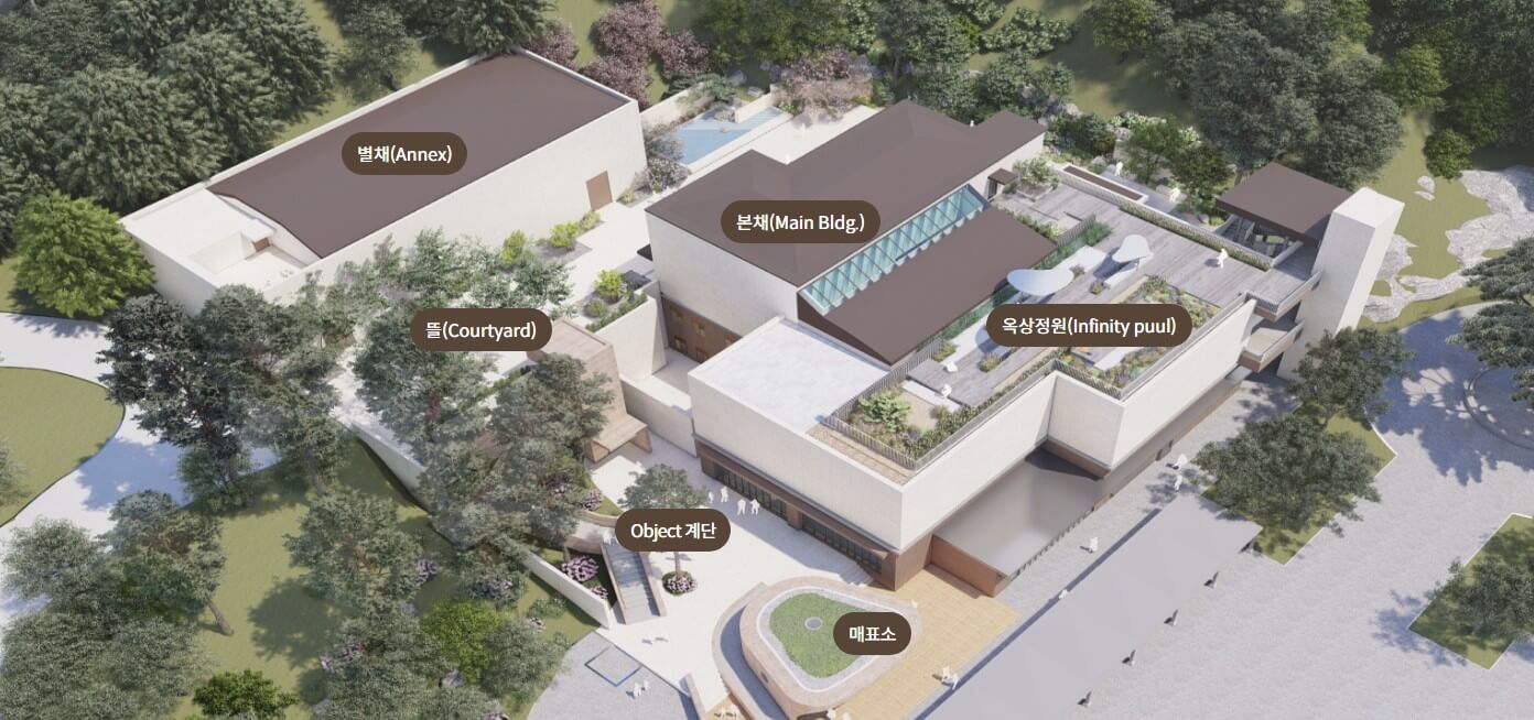 관람 동선은 오브제 계단, 별채, 뜰, 본채, 옥상정원, 화담숲 순으로 이어집니다.